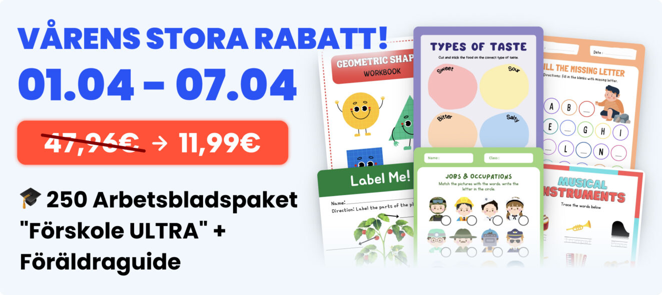 💰 Vanligtvis €47,96, men idag får du hela Förskole ULTRA-paketet + Förälderguiden för endast €11,99!