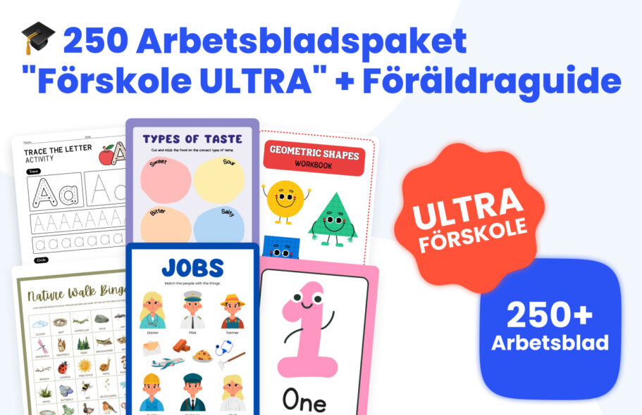 Vi har samarbetat med ledande pedagoger för att skapa Förskole ULTRA-paketet — en samling på över 250 arbetsblad designade för att stärka de exakta färdigheter ditt barn behöver innan skolan.